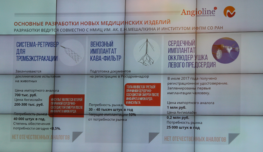 В январе на заседании рабочей группы по реализации программы индустриализации экономики Новосибирской области директор ООО «Ангиолайн» (Angiolaline) Андрей Кудряшов сообщал, что в перспективе «Ангиолайн» планирует приступить к выпуску трех новых медицинских изделий, два из которых не имеют аналогов в России. Это система-ретривер для тромбэкстракации, сердечный имплантат окклюдер ушка левого предсердия и венозный имплантат кава-фильтр. По первому заканчиваются доклинические испытания, цена иностранного аналога составляет 700 тыс руб, производства компании «Ангиолайн» — 200-300 тыс руб. Потребность рынка 40 тыс штук, а обеспеченность менее 0.5%. По сердечному имплантату получено регистрационное удостоверение и запланированы первые имплантации человеку. Цена импортного аналога 1 млн руб, новосибирской компании — 0,2 млн руб. Потребность рынка 25 тыс штук в год. По кава-фильтру идет подготовка документов на регистрацию в Росздравнадзор. Потребность рынка в этом медизделии составляет 30-40 тыс штук в год, а текущие имплантации составляют всего 10% от потребности.