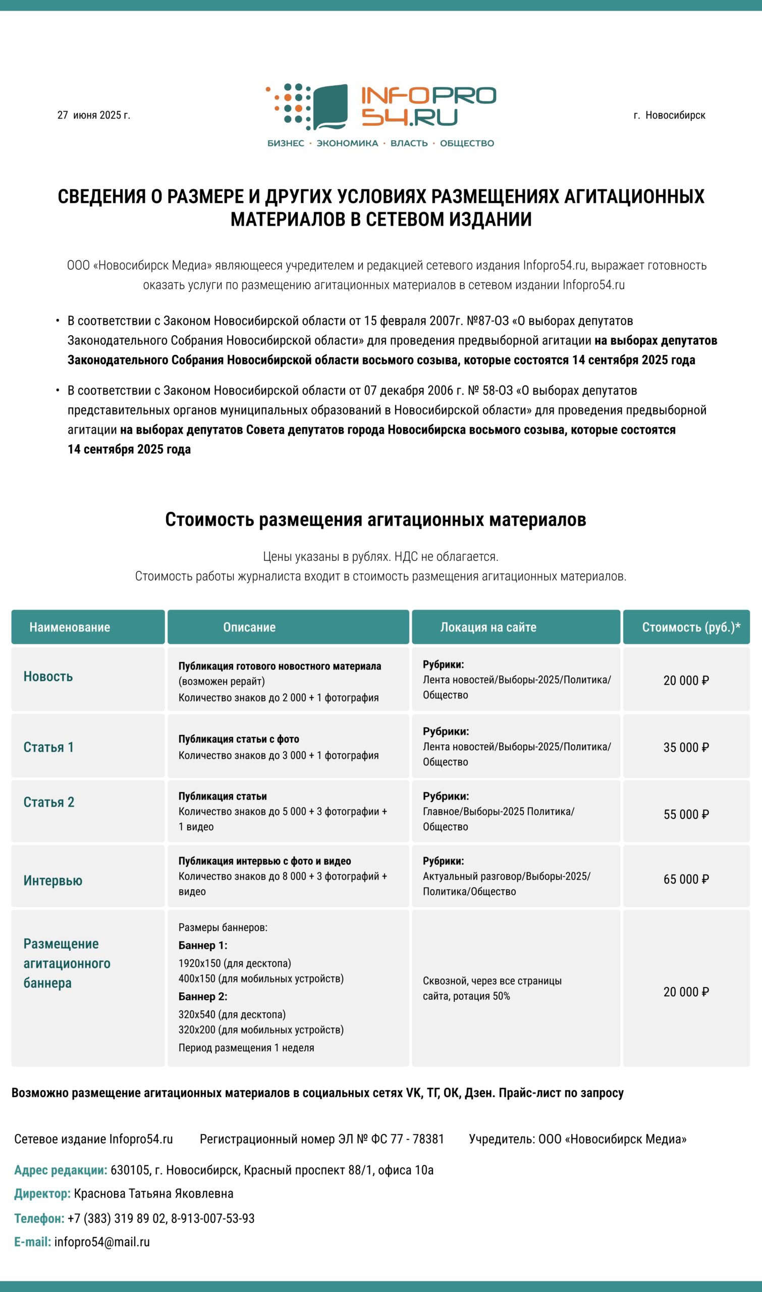 Infopro54.ru — информационно-аналитическое, сетевое издание. Регистрационный номер СМИ: ЭЛ № ФС 77 – 78381 от 29.05.2020 г, выдано Федеральной службой по надзору в сфере связи, информационных технологий и массовых коммуникаций (Роскомнадзор). Учредитель: Общество с ограниченной ответственностью «Новосибирск Медиа» Infopro54.ru - Новости Новосибирска и Новосибирской области. Новости Сибири.