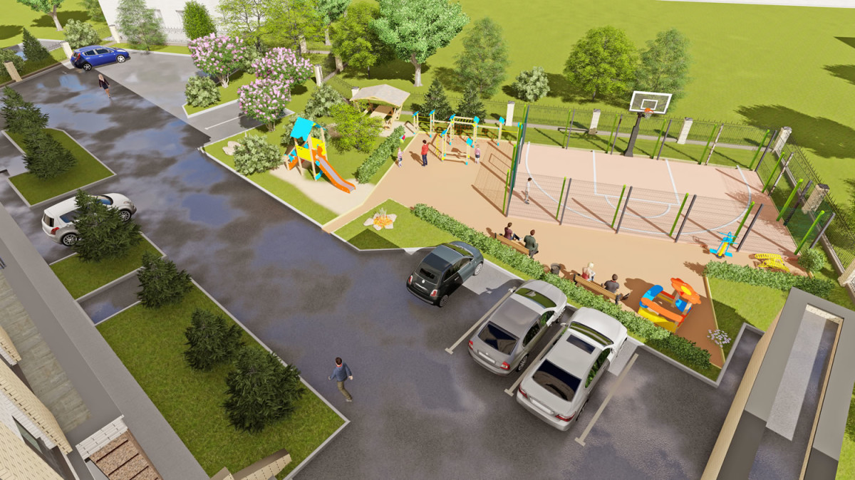 На территории комплекса расположена комфортная, привлекательная детская площадка, зона для занятия спортом: тренажеры для занятий на открытом воздухе, футбольно-баскетбольная зона.