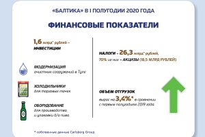 Отмечается, что объем инвестиций «Балтики» в I полугодии составил 1,6 млрд рублей. Большая часть этих средств была направлена на покупку холодильников для торговых точек, модернизацию очистных сооружений в Туле, а также оборудование для изготовления производства и упаковки безалкогольного пива. Налоговые отчисления компании в бюджет РФ в первой половине 2020 года составили около 26,3 млрд рублей, 70% из них — акцизы (18,5 млрд руб.)..