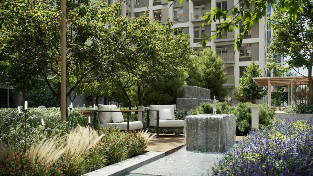 Чтобы идиома «рукой подать» была буквальной, внутренние пространства района тщательно выверялись. Так, чтобы плотность и компактность среды оставалась бы уютной, не становясь теснотой. Компенсаторно-профилактических находок по этой части много: градиентные пешеходные зоны с вариациями ярусов, продуманная векторизация дорожек, разнообразное озеленение и дизайнерские водно-динамические объекты. Да, есть озеро — талисман и символ района. Но творчески аранжированная вода и под рукой будет — в виде фонтанов небанального дизайна и водопадов. В общем, это принципы фэншуй, органично перенесенные в городскую среду. Причем горожанин-потребитель даже не будет ощущать это какой-то чужеродной экзотикой, стилем «шинуаезери» (во Франции 18 века была такая бытовая эстетика — в ней модная «китайскость» изготовленных во Франции фабричных вещей была доведена до трэш-абсолюта, до лютой «клюквы» — буквально вопреки инженерии и функционалу предметов).
