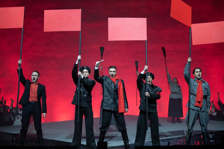 Чугунно-кумачово-стальная палитра молодого СССР сменяется сиянием неона, алюминия и полированного гранита — визуал ар-деко воспроизведён узнаваемо и любовно. Музыкальный театр этот навык ещё на «Великом Гэстби» отточил.