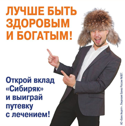 ВСЕМ вкладчикам, открывшим вклад от 10 тысяч рублей, Банк Акцепт дарит сертификат со скидкой 10% на приобретение путевок в санаторий «Сибиряк»!