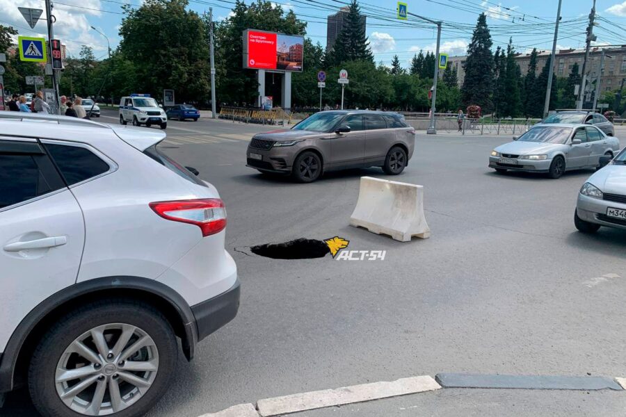21 июля в центре Новосибирска, на пересечении улиц Орджоникидзе и Красного проспекта, провалилась часть дорожного полотна.