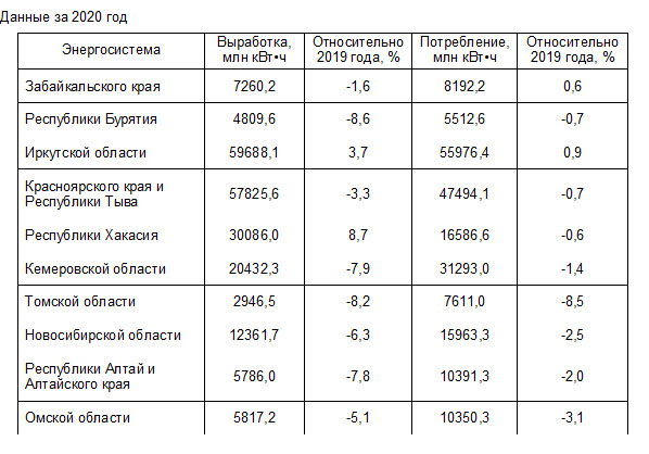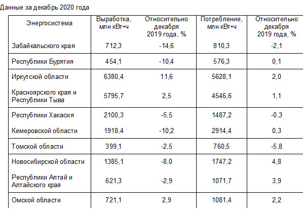 В декабре 2020 года электростанции ОЭС Сибири выработали 20487,9 млн кВт•ч, что на 0,8 % больше аналогичного показателя 2019 года.