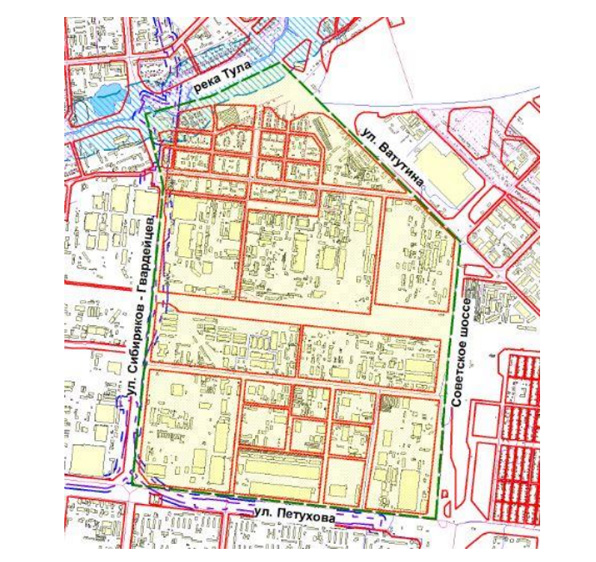 Территория ограничена ул. Ватутина, Советским шоссе, ул. Петухова, ул. Сибиряков-Гвардейцев и рекой Тулой.