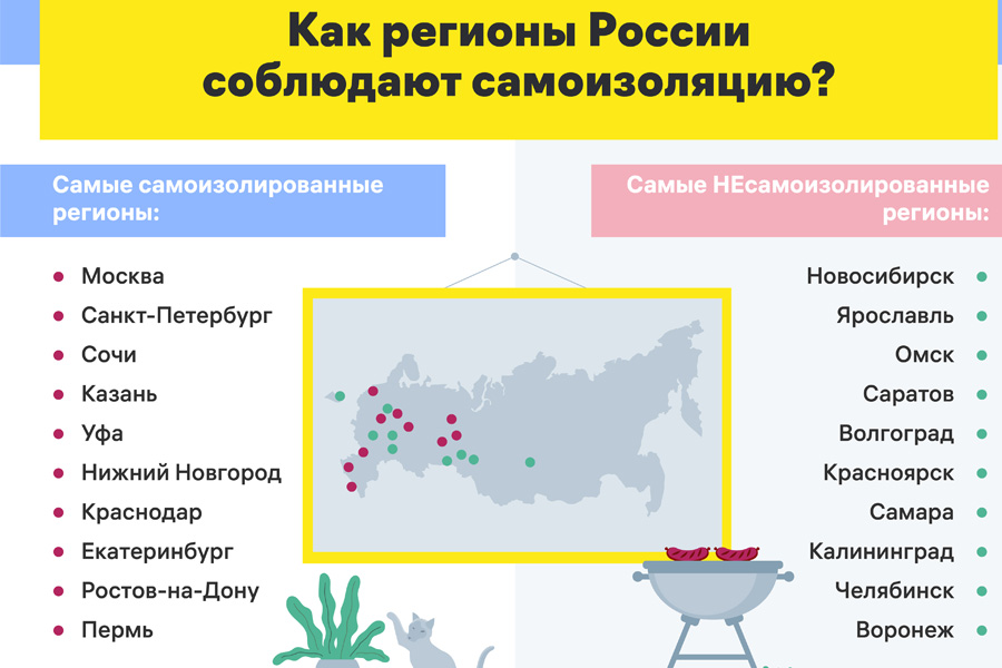 Согласно результатам анализа, наиболее строго соблюдают самоизоляцию жители двух столиц и Сочи. В топ-5 самых осторожных городов также вошли Казань и Уфа. Меньше всего изменяют привычным потребительским привычкам жители Новосибирска, Ярославля, Омска, Саратова и Волгограда.