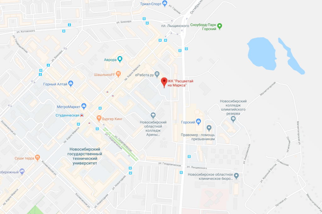 Локация ЖК «Расцветай на Маркса» соединяет бесспорную «центральность» и парковый уют. Комплекс расположен в квартале, сочетающем и то, и другое — в треугольнике, который образуют собой проспект Маркса, улица Немировича-Данченко и улица Космическая.