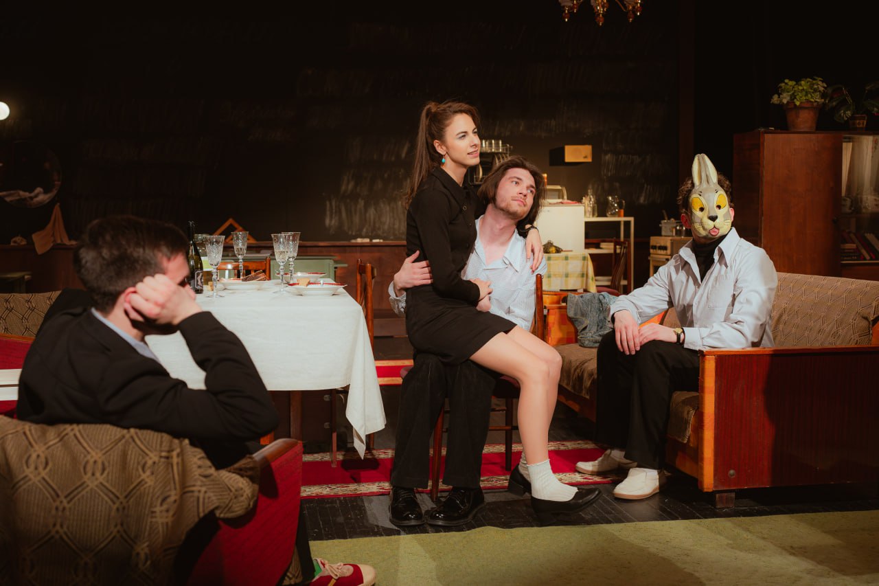 Спектакль по пьесе Людмилы Разумовской «Дорогая Елена Сергеевна» (18+) увидел свет в последнюю полную неделю мая — в разгар школьных «последних звонков», в канун выпускных экзаменов. Выпускницы в типовом гротескно-карнавальном образе «Наташка-первоклашка» (фартучек, бантики, гольфики + отчетливо фертильная внешность) создали весьма ироничный контекст для спектакля, чей Хронос и сюжет — выпускной ажиотаж.