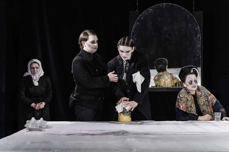 Угольно-черные волосы Маменьки, стоящие как тиара Нефертити, прошитые одинокой молнией белой прядки — ироничный оммаж к американской индустрии ужаса. Впрочем, ирония — весомый ингредиент спектакля. Но ирония эта достаточно неуютная. Не комедийная, а трагифарсовая.