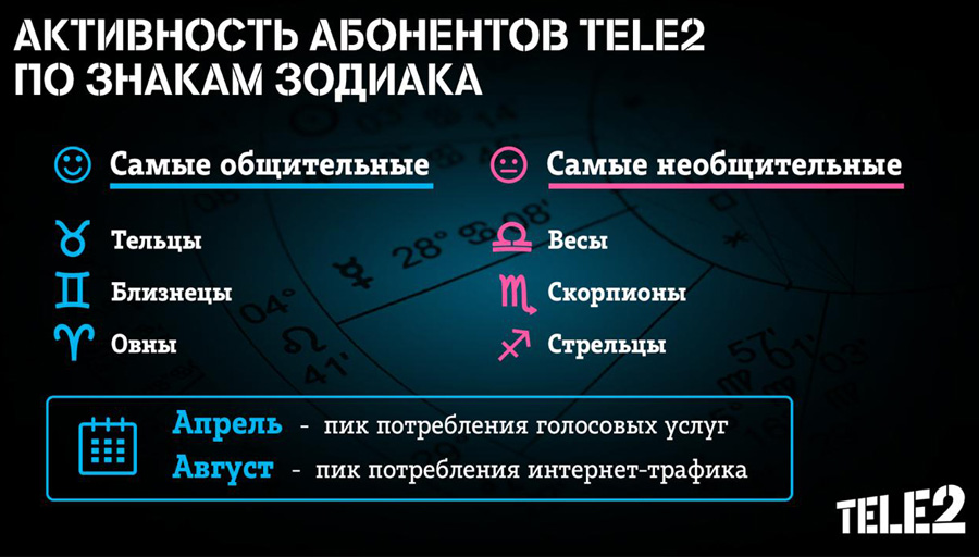 В 2020 году представители разных знаков зодиака чаще всего общались друг с другом в апреле – в период строгой самоизоляции людям понадобилось наибольшее количество минут разговоров, чтобы быть на связи с друзьями и близкими. Максимальное число гигабайтов скачали в августе – именно в этом месяце клиенты Tele2 стали чаще путешествовать по России и за границу.