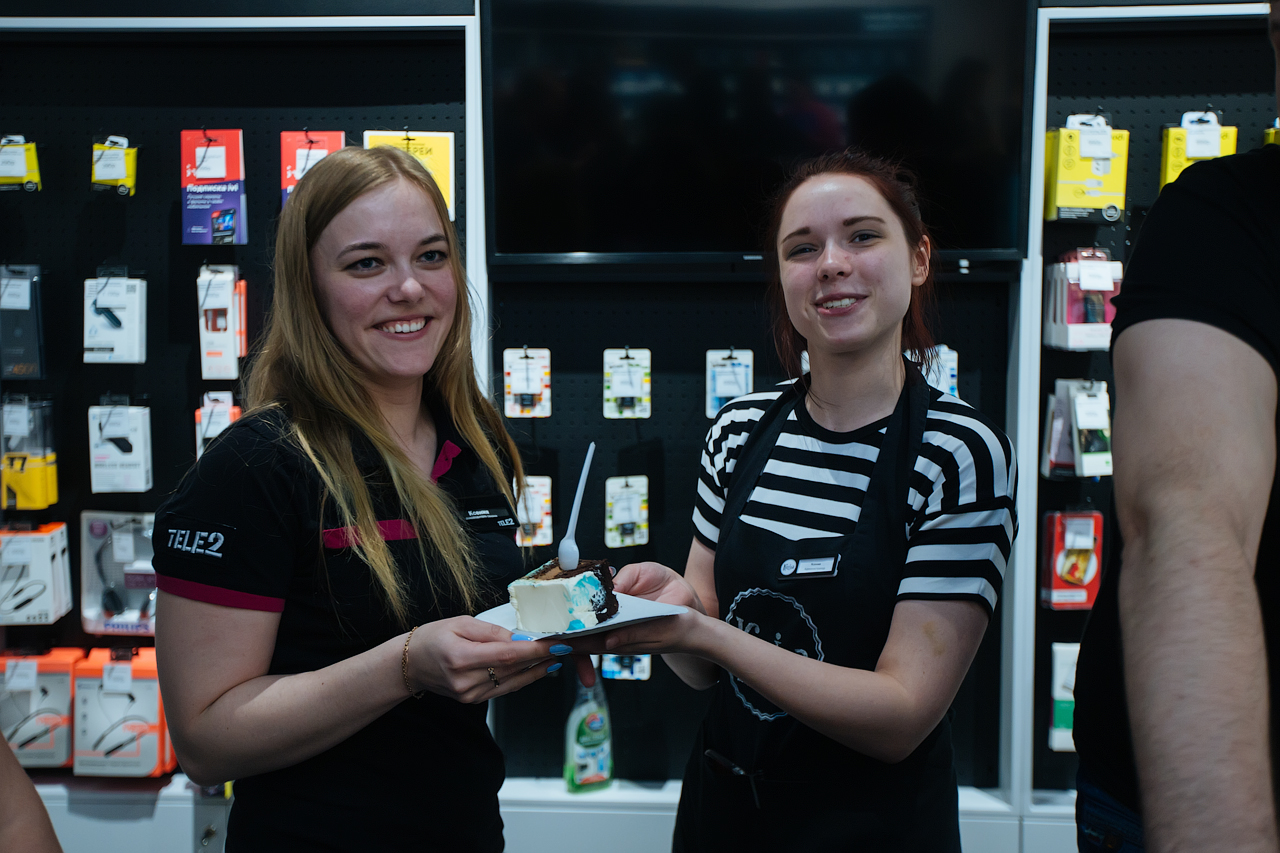 В одном совмещенном торговом зале расположены салон связи Tele2 и кондитерская Kuzina. Здесь посетители могут произвести все операции с номером и счетом, купить мобильное устройство или модный аксессуар к нему, воспользоваться услугами денежных переводов и страхования, а также купить хороший кофе и свежую выпечку.