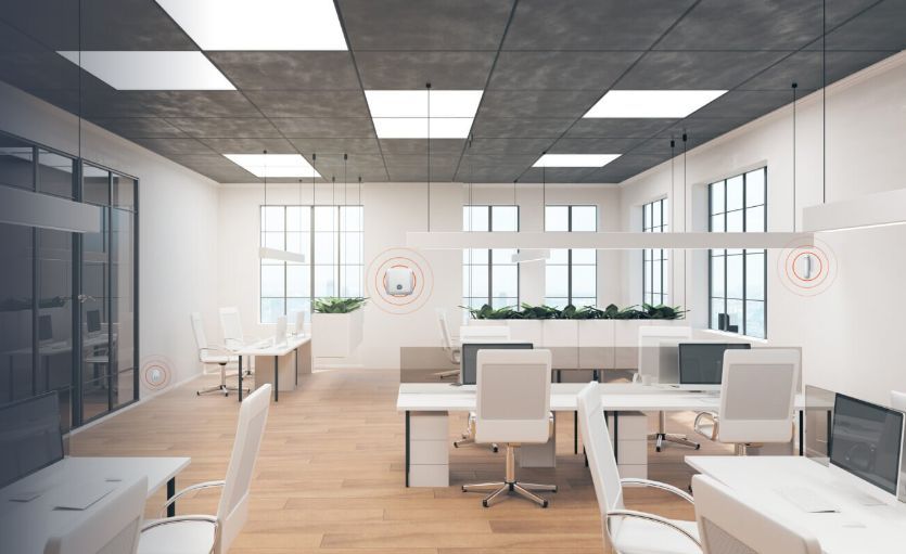 «Умный офис» — это система беспроводных датчиков и устройств, которая устанавливается в помещении и работает по заданному сценарию. Техническое решение включает в себя датчики задымления, протечки, движения, открытия дверей или окна, а также умные лампочки и розетки. Все комплекты подключаются к контроллеру, который управляет приборами по заданным настройкам и передает данные в личный кабинет заказчика.