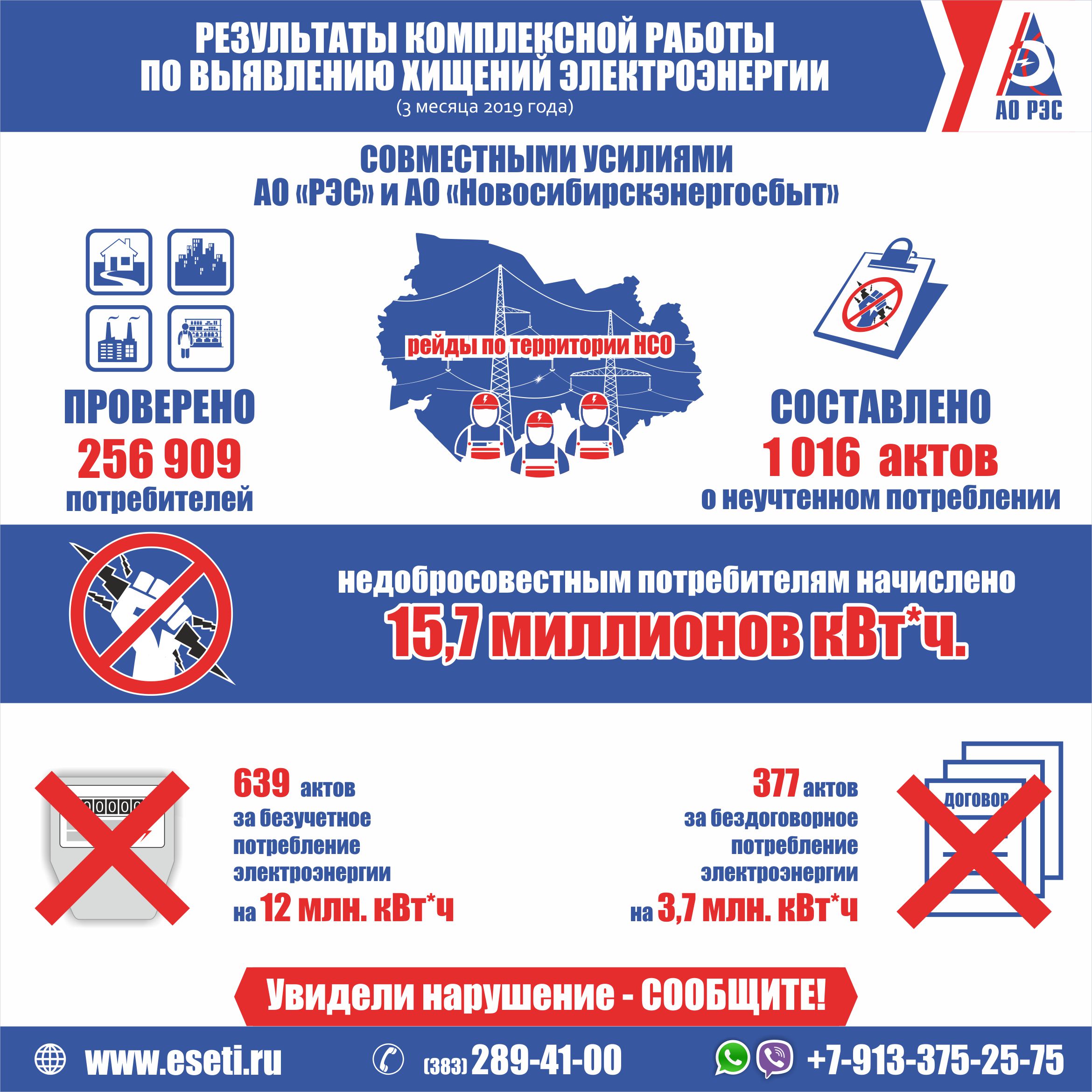 Деятельность, направленная на борьбу с хищениями электроэнергии, была продолжена и в текущем году. Только за 1 квартал 2019 года совместными усилиями АО «РЭС» и АО «Новосибирскэнергосбыт» на территории Новосибирской области проведена проверка приборов учета и снятие контрольных показаний у 256 909 потребителей, что на 7 % выше уровня аналогичного периода прошлого года.