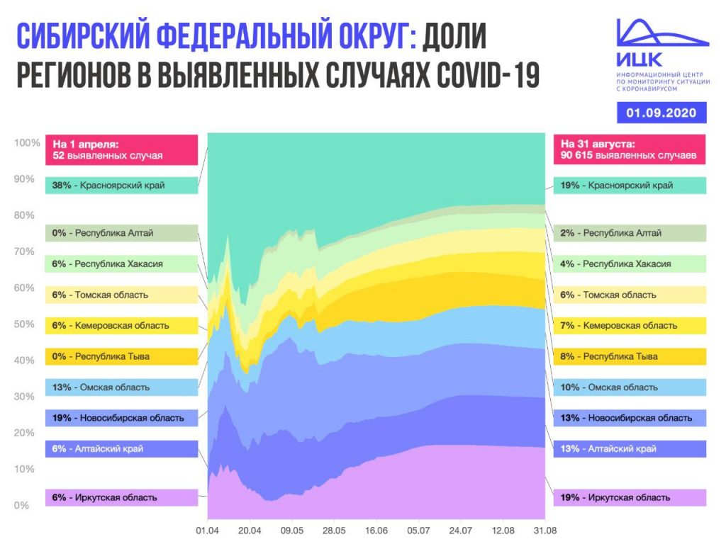 Эпидемия коронавируса в Сибири началась позже, чем в центральной части России. Во всем Сибирском федеральном округе 1 апреля было зарегистрировано 52 случая заболевания COVID-19. 31 августа — уже 90 615 случаев, напомнили в Информационном центре по мониторингу ситуации с коронавирусом (ИЦК).