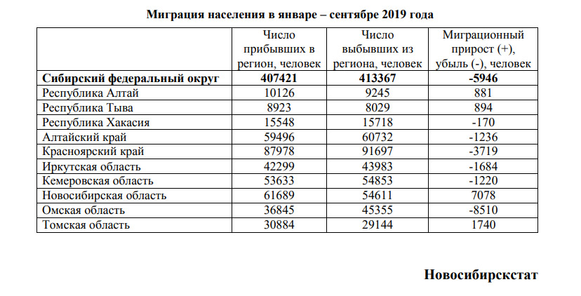 По предварительным данным, в январе – сентябре 2019 года миграционная убыль численности населения Сибирского федерального округа составила 5,9 тыс. человек. Наибольшая миграционная убыль сложилась в Омской области (8,5 тыс. человек), сообщили в Новосибирскстате.