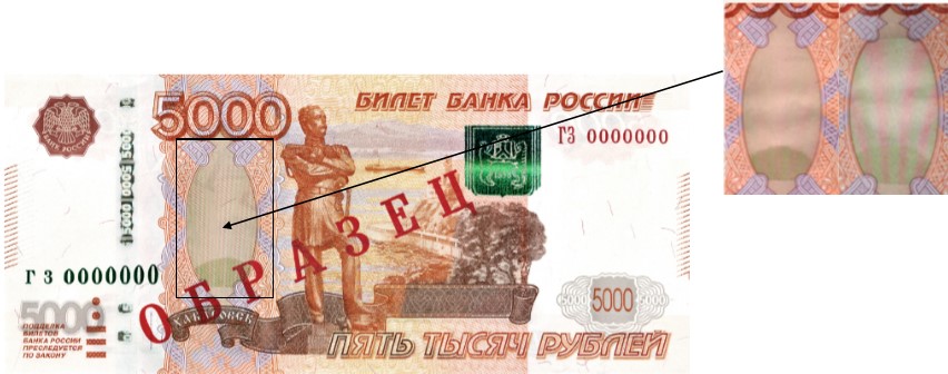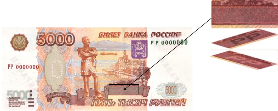 Вторую группу признаков легко проконтролировать, изменяя угол зрения. Так называемый кипп-эффект можно увидеть на орнаментальной ленте с лицевой стороны купюры. Если смотреть на нее под острым углом, на ленте появляются буквы «РР». При взгляде на банкноту прямо букв не видно. Кипп-эффект реализован на всех российских купюрах.