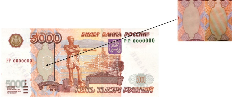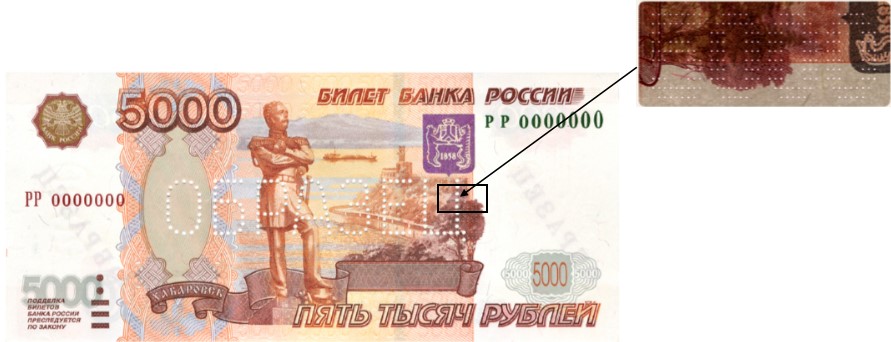 Еще один защитный признак — микроперфорация — число «5000», выполненное параллельными рядами микроотверстий. Его видно только на просвет, а на ощупь отверстия не ощущаются. И водяной знак, и микроперфорация есть как на первых 5000-ных, так и на купюрах модификации 2010 года.
