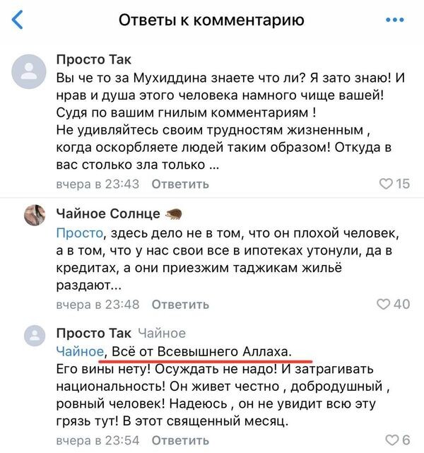 — Вы че то за Мухиддина знаете что ли? Я зато знаю! И нрав и душа этого человека намного чище вашей! Всё от Всевышнего Аллаха! Его вины нету!, — вступился за главу семейства один из пользователей соцсети.