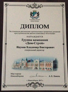 Мэр Новосибирска А.Е. Локоть наградил дипломом ГК «Дом-Строй» за успешную реализацию оригинальных проектных решений при строительстве жилого комплекса «Флотилия».
