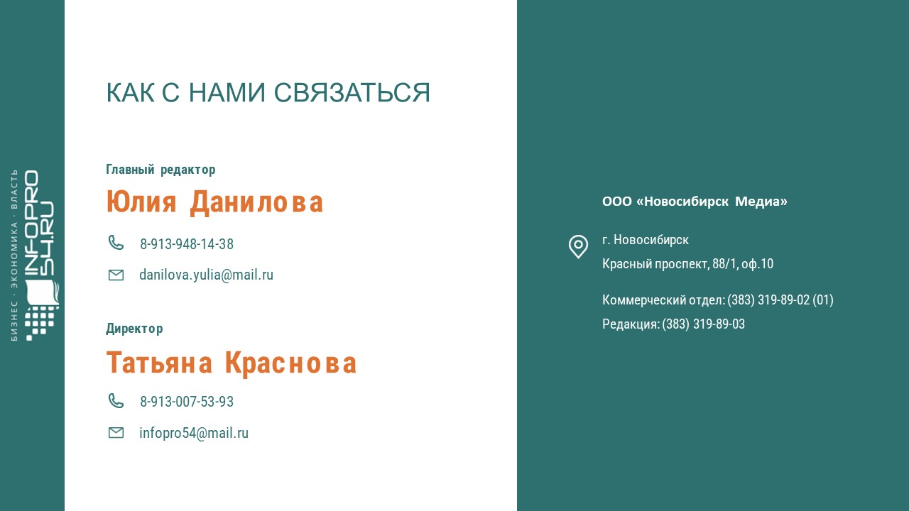 По вопросам рекламно-информационного сотрудничества: Светлана Ванесян. (383) 319-89-02, +7 (913) 737-53-28, reklama@infopro54.ru