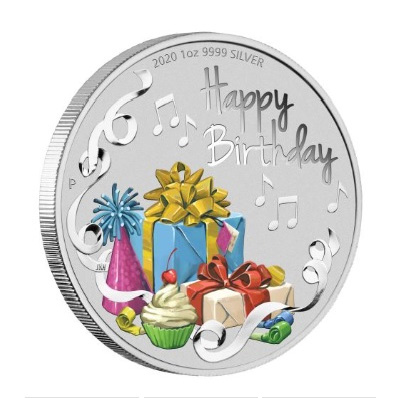 В дизайне монеты «С Днем рождения» («Happy Birthday») используются яркие цвета: на реверсе изображены разноцветные подарки и надпись «Happy Birthday». Номинал – 1 австралийский доллар. Масса чистого серебра в монете — 1 тройская унция (31,1 грамма). Упаковка – подарочная открытка с красивым рисунком на обложке и поздравительной надписью на английском языке внутри.