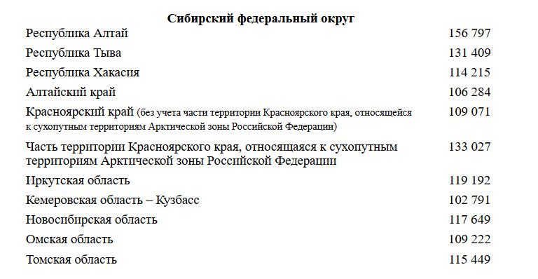 В Сибирском федеральном округе самый высокий норматив планируется установить в Республике Алтай (156 797 рублей, на 974 рубля больше, чем во втором квартале), Республике Тыва (131 409 рублей, -437 рублей) и в части Красноярского края в Арктической зоне — (133 027 рублей, +1758 рублей). Самый низкий — в Кемеровской области (102 791 рубль, -221 рубль) и Алтайском крае (106 284 рубля, -674 рубля).