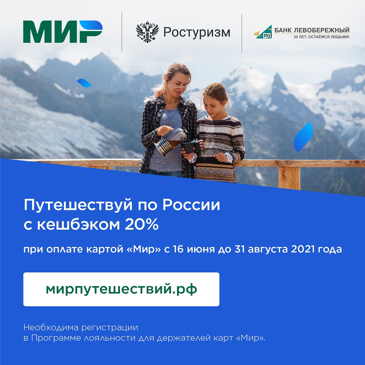 Акция действует с 18.03.2021 по 31.08.2021. Периоды приобретения туристских услуг: с 18.03.2021 по 15.06.2021 и с 16.06.2021 по 31.08.2021. Сведения об Операторе (Организаторе) Акции, правилах проведения Акции, размере кешбэка*, начисляемого Клиенту, и правила Программы лояльности для Держателей карт «Мир» доступны на сайте.