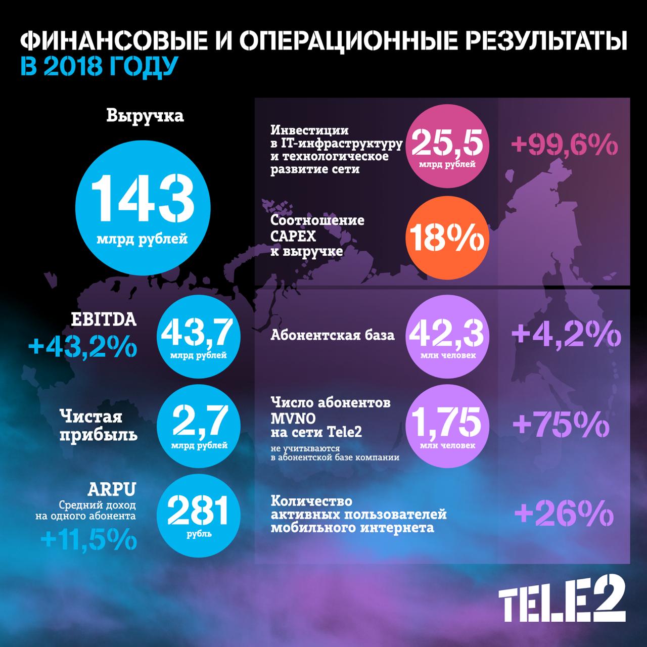 — Успешные финансовые и операционные результаты Tele2 подтверждают эффективность нашей бизнес-стратегии и коммуникационной платформы «Другие правила». В течение года мы регулярно запускали инновационные продукты, укрепляя репутацию трендсеттера телеком-рынка. В прошлом году Tele2 строила сети LTE вдвое быстрее конкурентов, и клиенты уже оценили качество нашего 4G – средний трафик на одного пользователя мобильного интернета вырос почти на 45% год к году. Знаковым событием 2018 года для нас стал выход на чистую прибыль, и в этом году мы продолжим ее наращивать. Также мы сосредоточимся на развитии основного драйвера выручки – передаче данных – и дальнейшем снижении соотношения долга к EBITDA, — отметил генеральный директор Tele2 Сергей Эмдин.