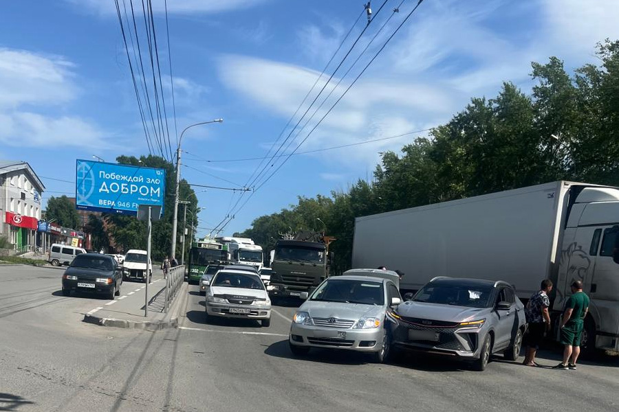 22 июня на улице Петухова возле жилмассива «Акатуйский» в результате столкновения грузового автомобиля с легковушкой оказались заблокированы обе полосы дороги в сторону Хилокской и трамвайные пути.
