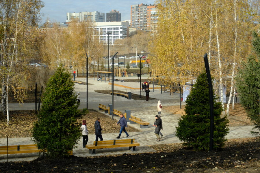Благоустройство общественной территории, находящейся в плотной городской застройке, стало возможным благодаря поддержке Правительства Новосибирской области. Опросы жителей близлежащих районов показали острую потребность в рекреационной зоне. Проект создавался с участием жителей, и площадь парка была увеличена в ходе обсуждений. Первый этап включал в себя прокладку инженерных сетей, строительство дорожек и лестниц, монтаж ливневой канализации и освещения, а также начало обустройства игровых и спортивных зон. Существующие деревья были сохранены, а новые посадки гармонично вписаны в ландшафт. В следующем году будут добавлены зоны отдыха и озеленение.