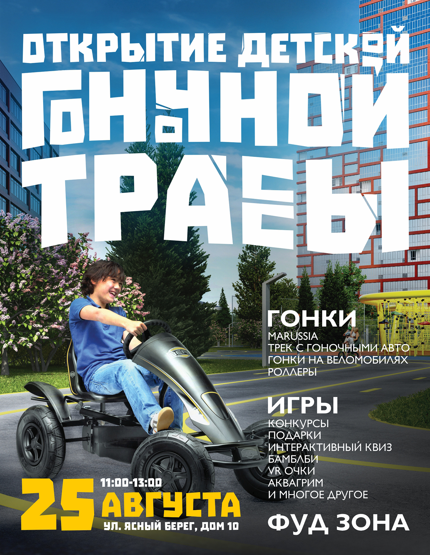 В программе зрелищная гонка на веломобилях, многочисленные фотозоны, в том числе с первым российским спорткаром, возможность побывать в патрульном автомобиле, попробовать виртуальную реальность, принять участие в конкурсах, викторинах и других активностях. После гонки дети смогут покататься на веломобилях абсолютно бесплатно.