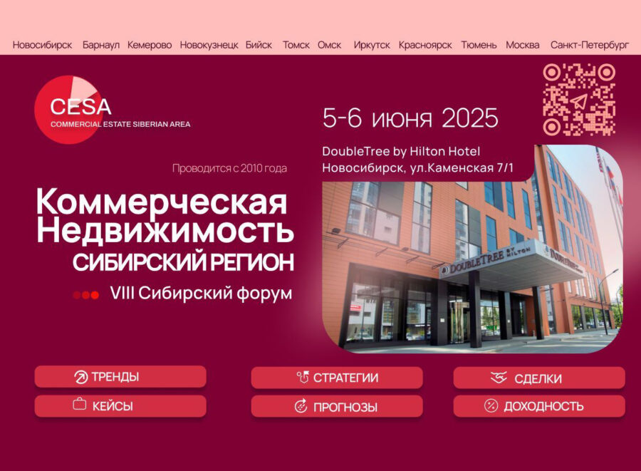 VIII Сибирский форум «Коммерческая недвижимость. Сибирский регион» пройдет в Новосибирск 5-6 июня. Мероприятие объединит инвесторов, девелоперов, владельцев и управляющих коммерческими объектами, а также представителей власти и экспертного сообщества для обсуждения трендов, стратегий и сделок на рынке.