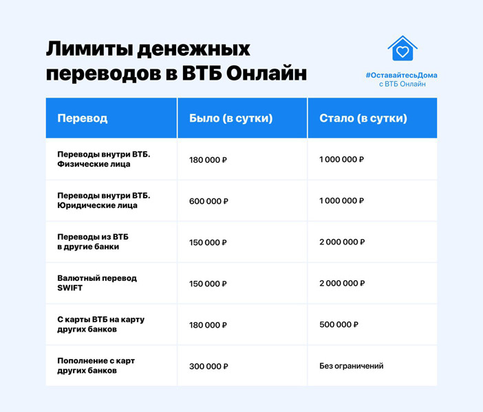 Новые условия по переводу крупных сумм в ВТБ-Онлайн доступны розничным клиентам сегментов «Масс», «Привилегия» и «Прайм». Решение ВТБ является продолжением мер поддержки, которые принимают органы власти и Банк России по предотвращению распространения COVID-19.