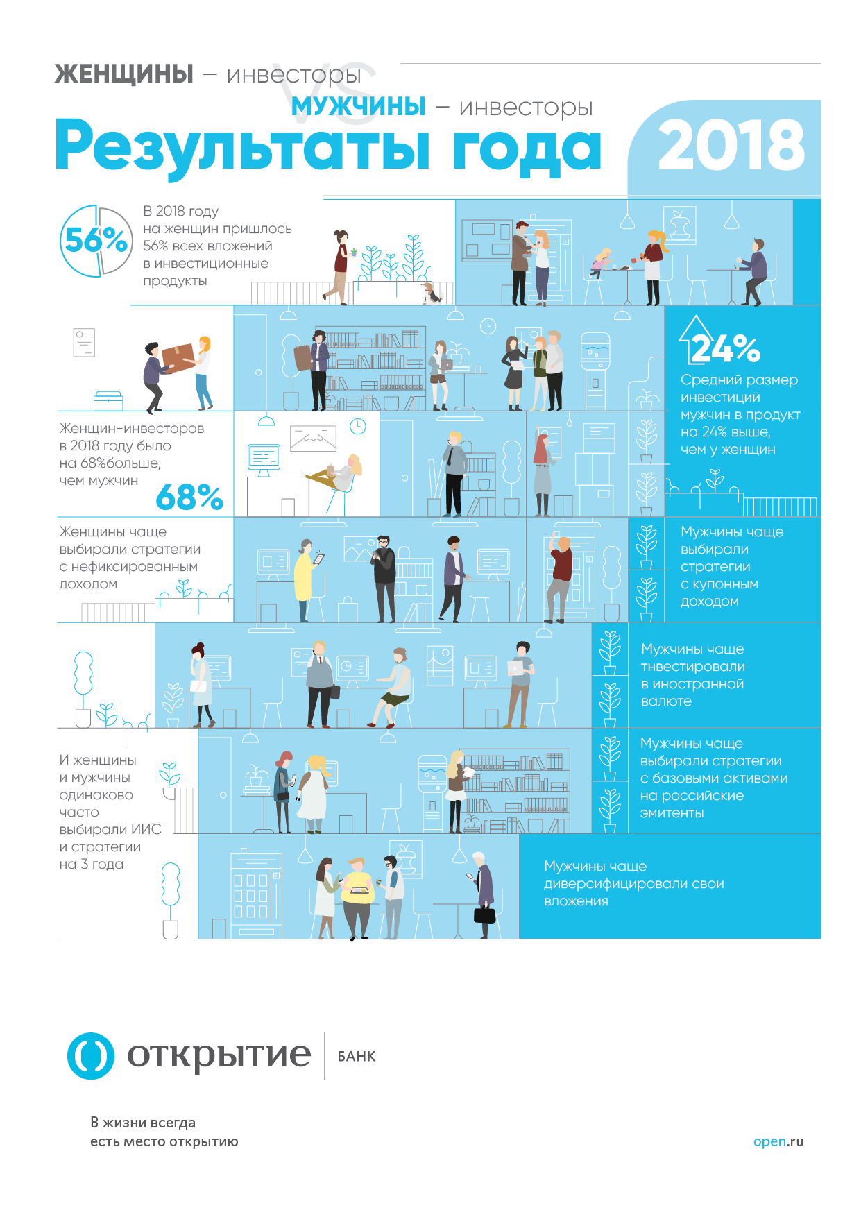 Отмечается, что средний размер вложений мужчин в различные инвестиционные продукты банка «Открытие» в 2018 г. превысил 550 тыс. руб. Это на 24% больше среднего размера вложений женщин (445 тыс. руб).